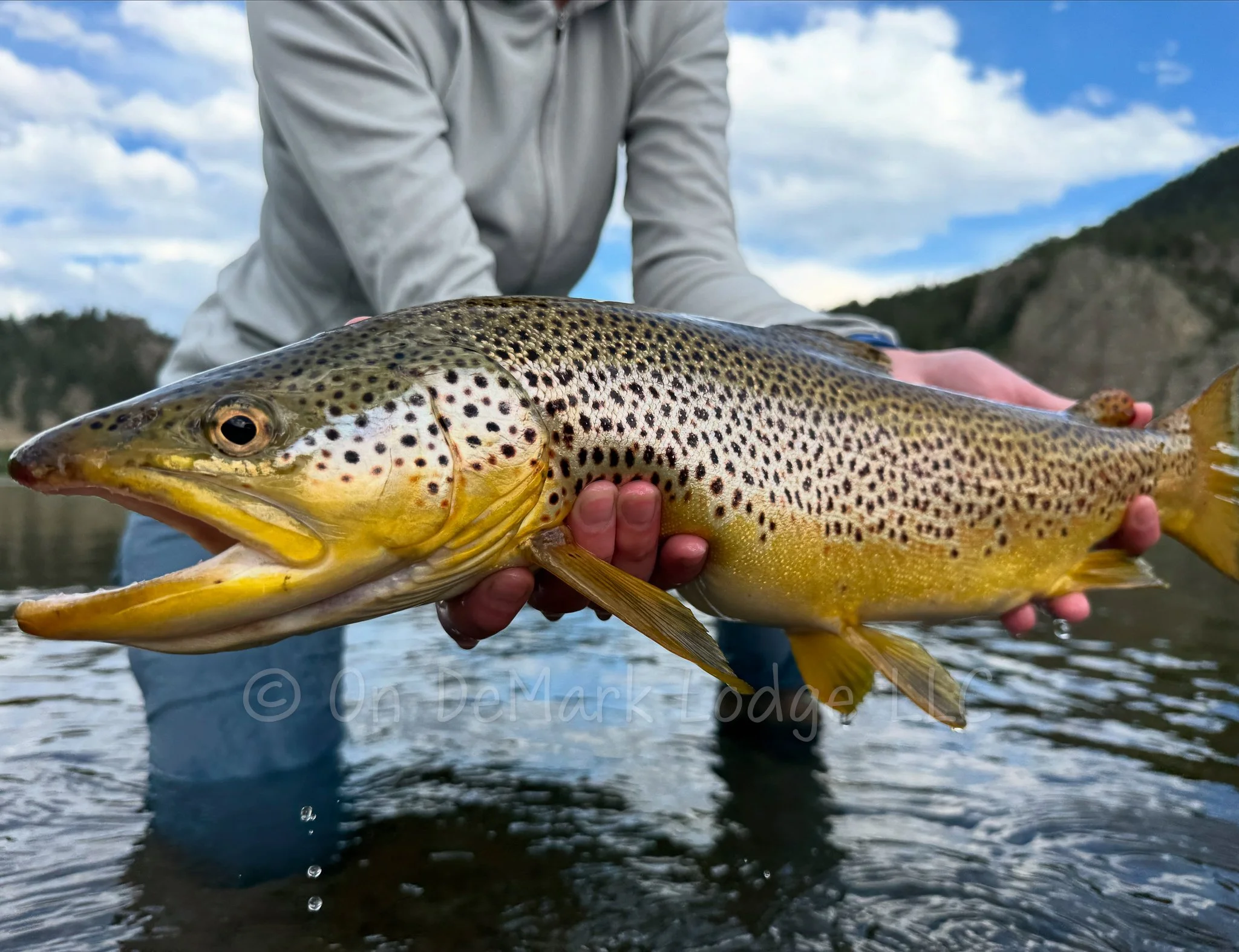 This is where the observation part of the equation comes into play. We’re looking in those places that the big browns like to feed. It takes some self-control to not cast to the pods of 18 inch rainbows while you’re scanning the river. The big fish like to eat alone. Look for those individual fish feeding close to a bank, super shallow riffles, or dead water deep pools. The tell-tale sign of the browns is a nose that resembles an alligator and a pillow white inside of the mouth when they eat.